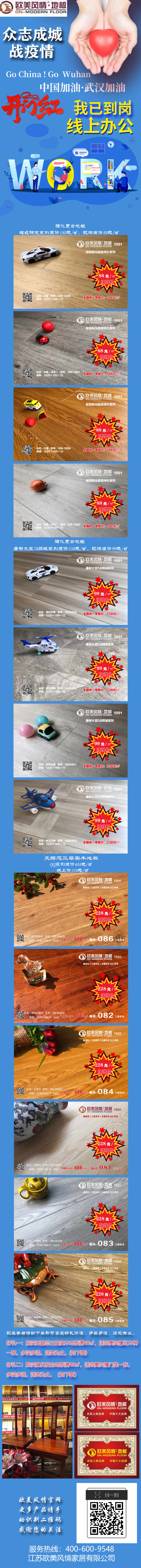 战疫情!度难关!送爱心!送温暖!近日【欧美风情地板】集团公司董事长亲自部署亲自指挥全国专卖店全体员工召开“战疫情送温暖”【新销售为人民服务】为主题微信电话会议拉开帷幕!非常时期!足不出户!线上办公!线上订单!同时各专卖店经销商尊重承诺不满意无条件退换服务!2020欧美风情新产品惠民政策优惠活动线上订单正在火爆进行中!消费者线上订单“送温暖”折扣优惠价值千余元!购满40平方米“送爱心”送礼品价值百余元!总部决定对于疫情重症患者十分困难的家庭可以向总部申请免费赠送40平方强化复合地板捐助爱心活动支持!中国加油武汉加油【江苏欧美风情家居有限公司】祝全国人民幸福平安!